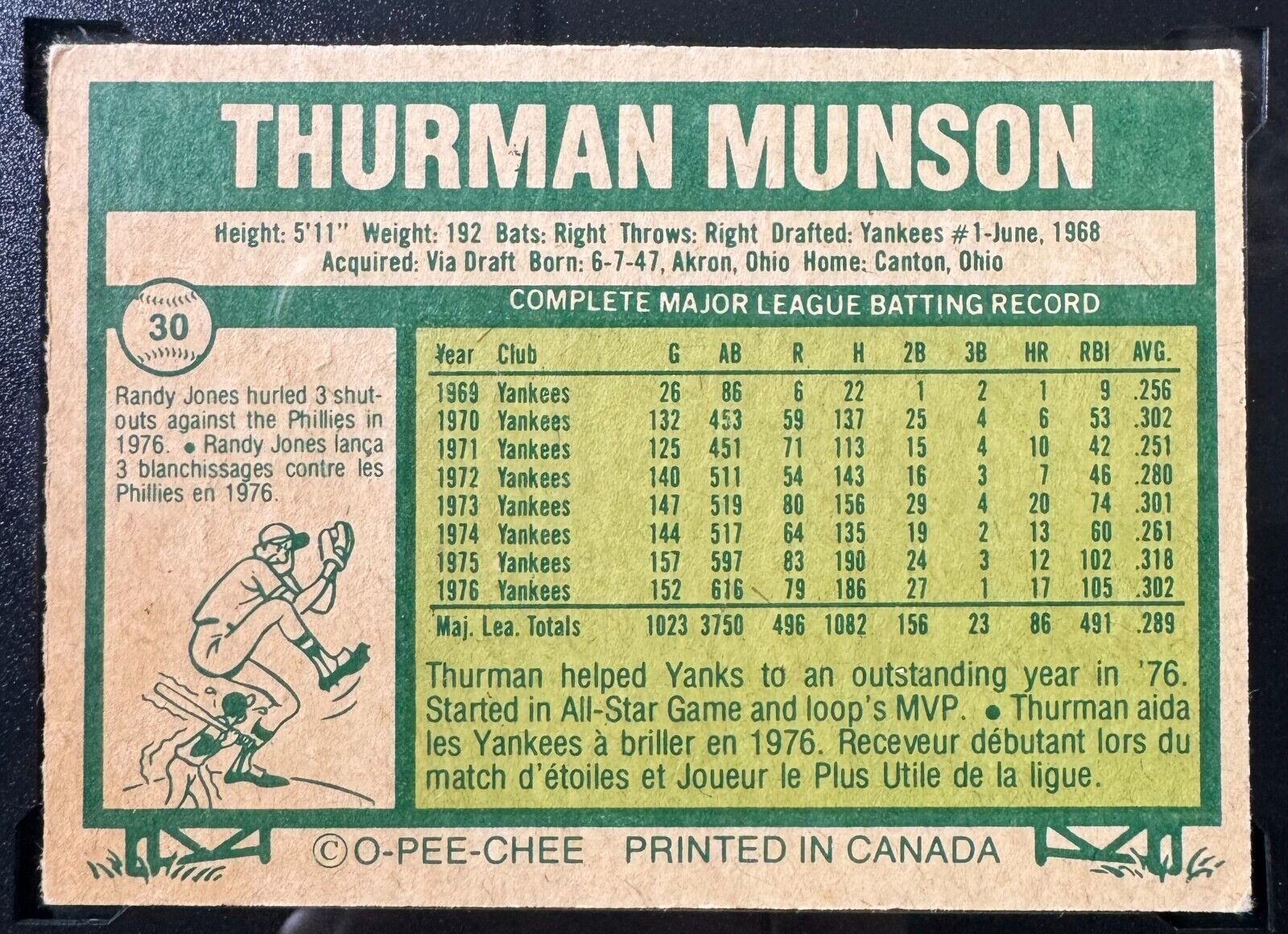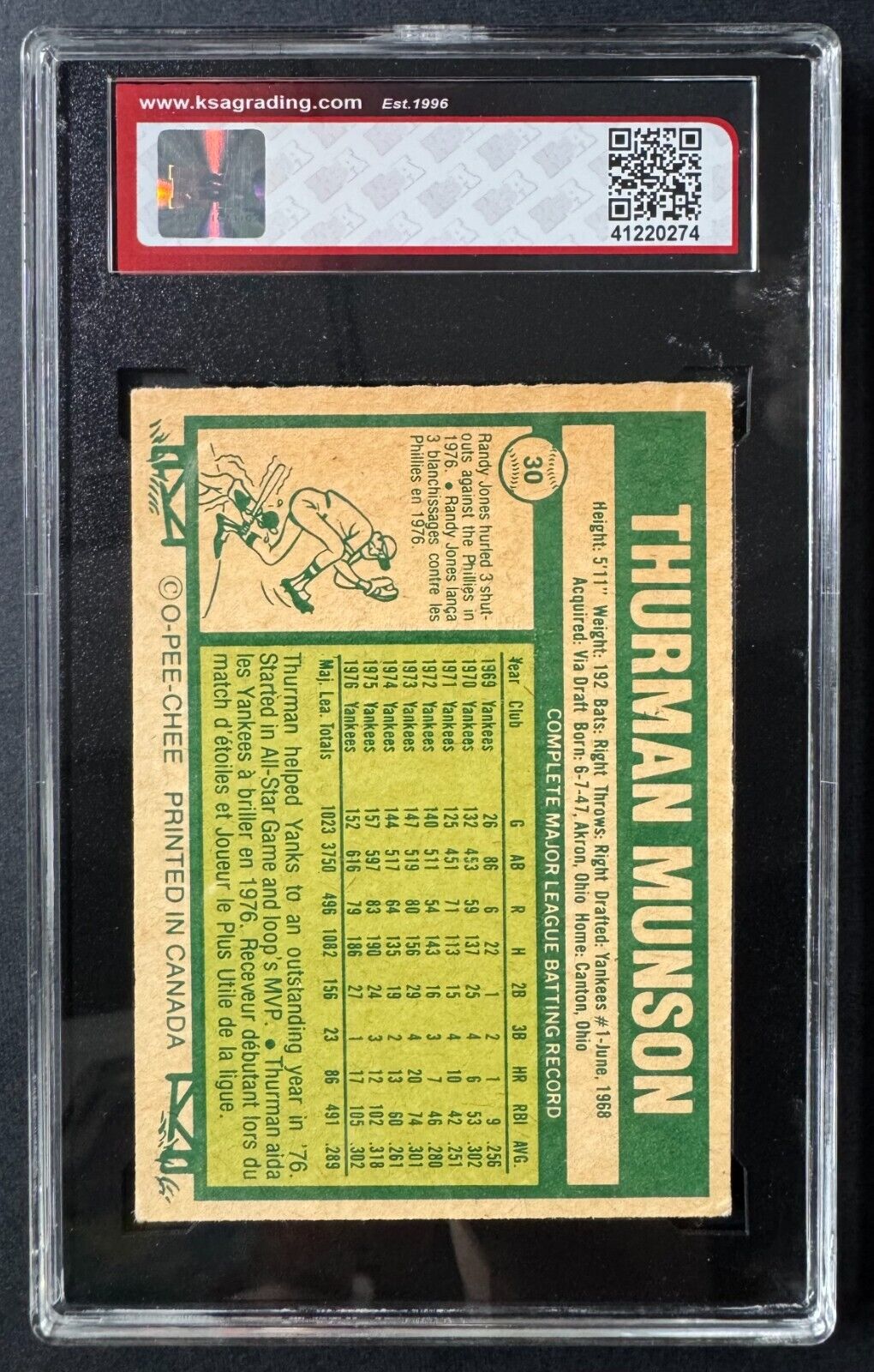 - 1977 O-PEE-CHEE #30 Thurman Munson Card KSA 7.5 NM+