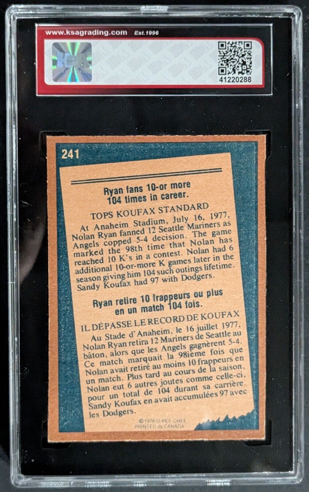 - 1978 O-PEE-CHEE #241 Nolan Ryan Record Breaker Card KSA 7 NM