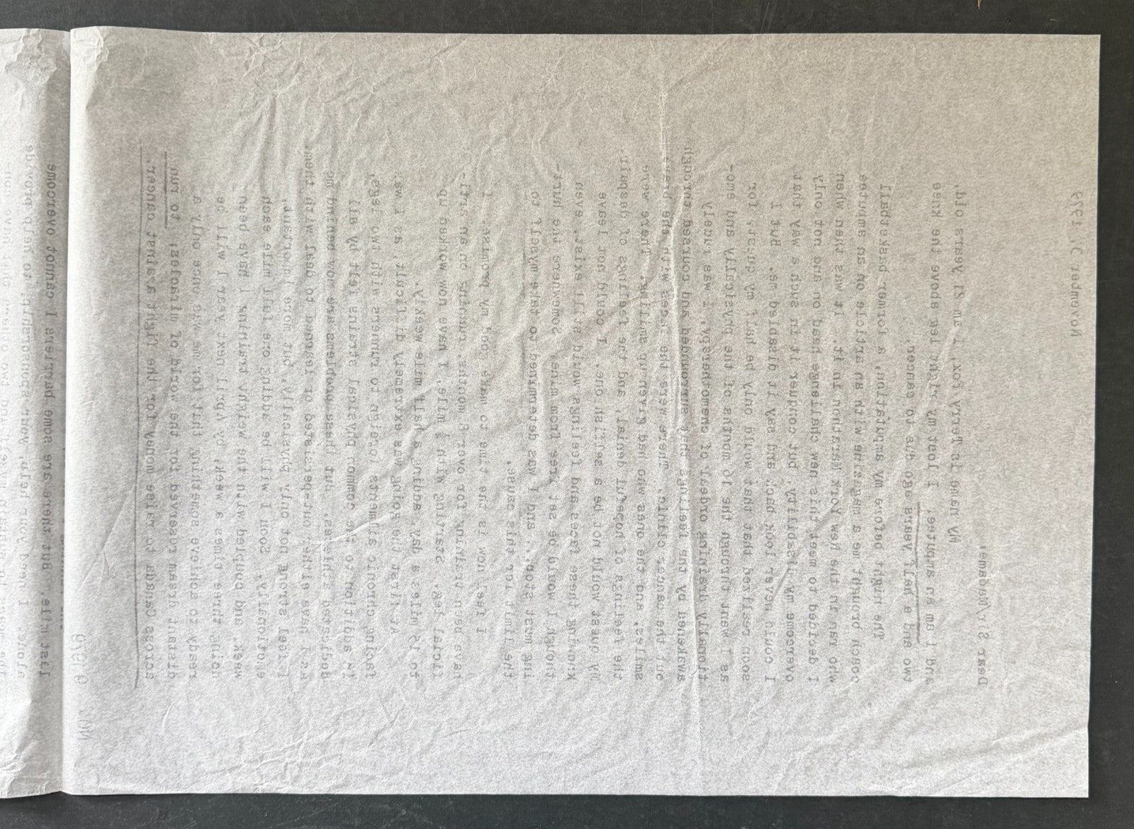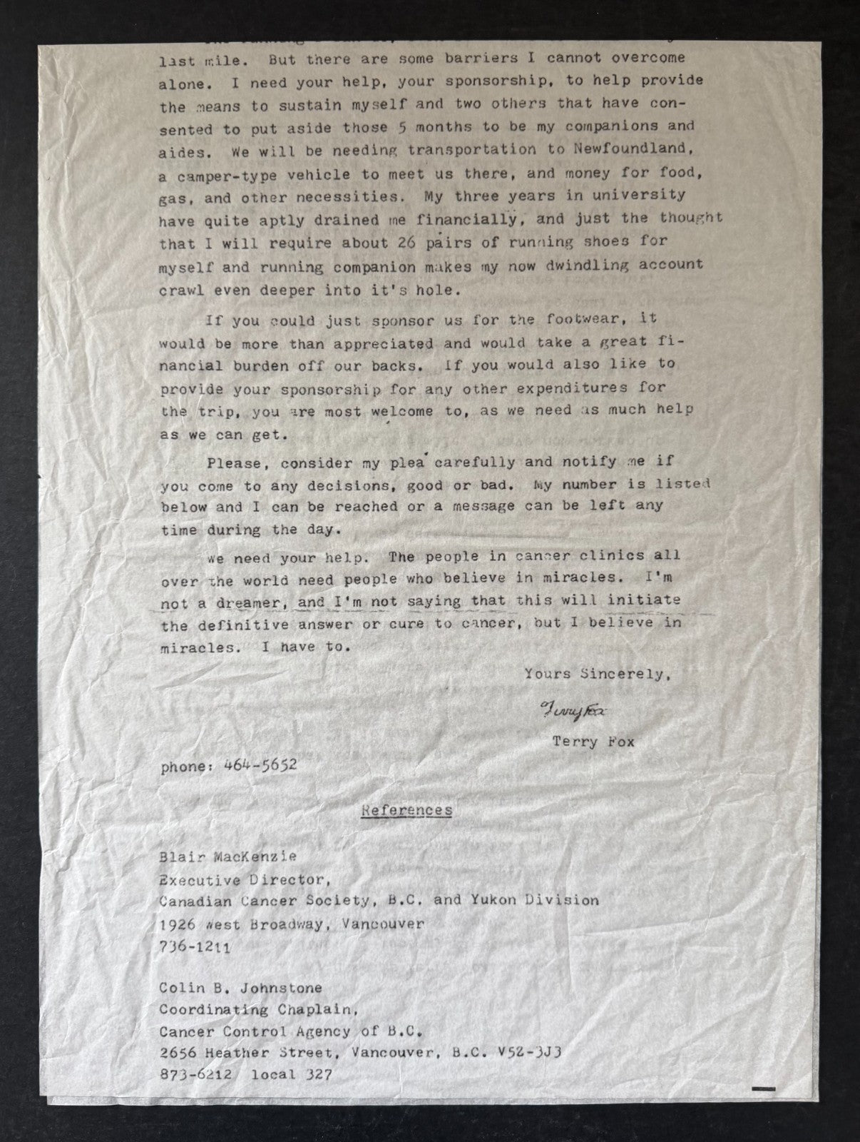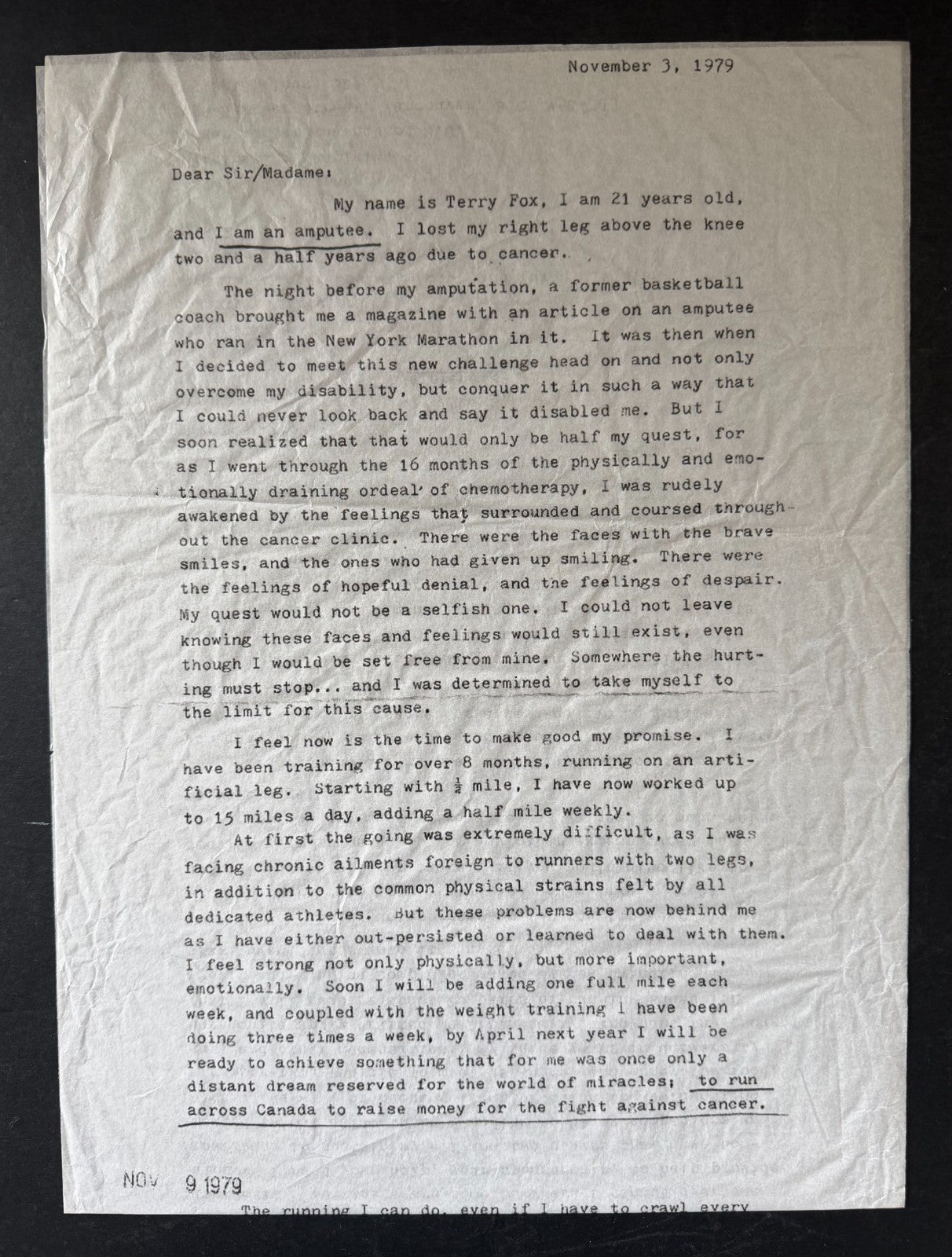 • Nov. 3, 1979 letter from Terry Fox to Addidas asking the company for 26 pairs of running shoes to be used during his cross Canada Marathon Of Hope.