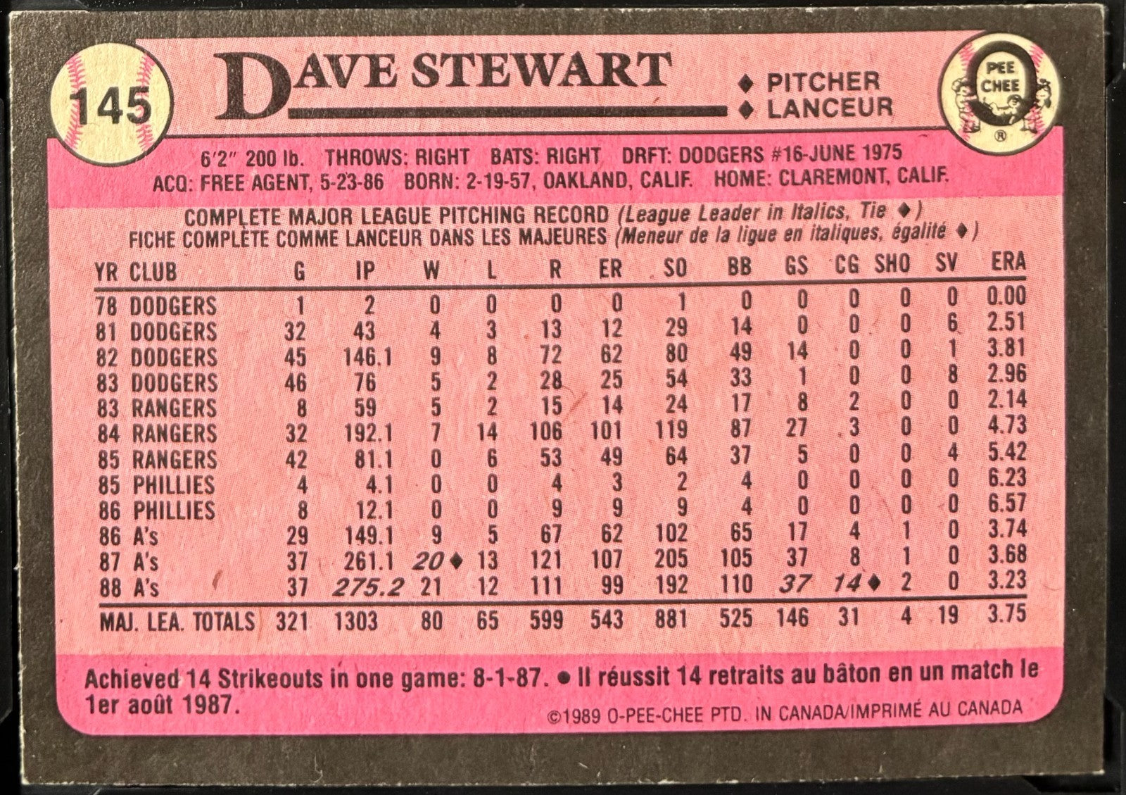 - Dave Stewart was a dominant MLB pitcher best known for the Oakland Athletics, also playing for the Los Angeles Dodgers, Texas Rangers, Toronto Blue Jays, Philadelphia Phillies, and San Diego Padres. A three-time World Series champion (1981 Dodgers; 1989, 1990 Athletics), Stewart won 20+ games four straight seasons (1987–1990), earned ALCS MVP honours in 1989, was a two-time All-Star, and later served as an MLB executive and front-office executive with the Arizona Diamondbacks.
