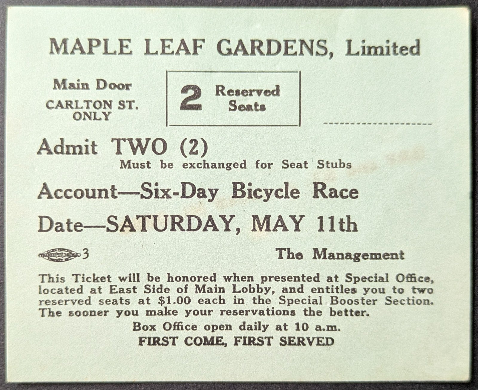 - Circa 1930s Maple Leaf Gardens Unused Ticket For 6 Day Bicycle Race Toronto