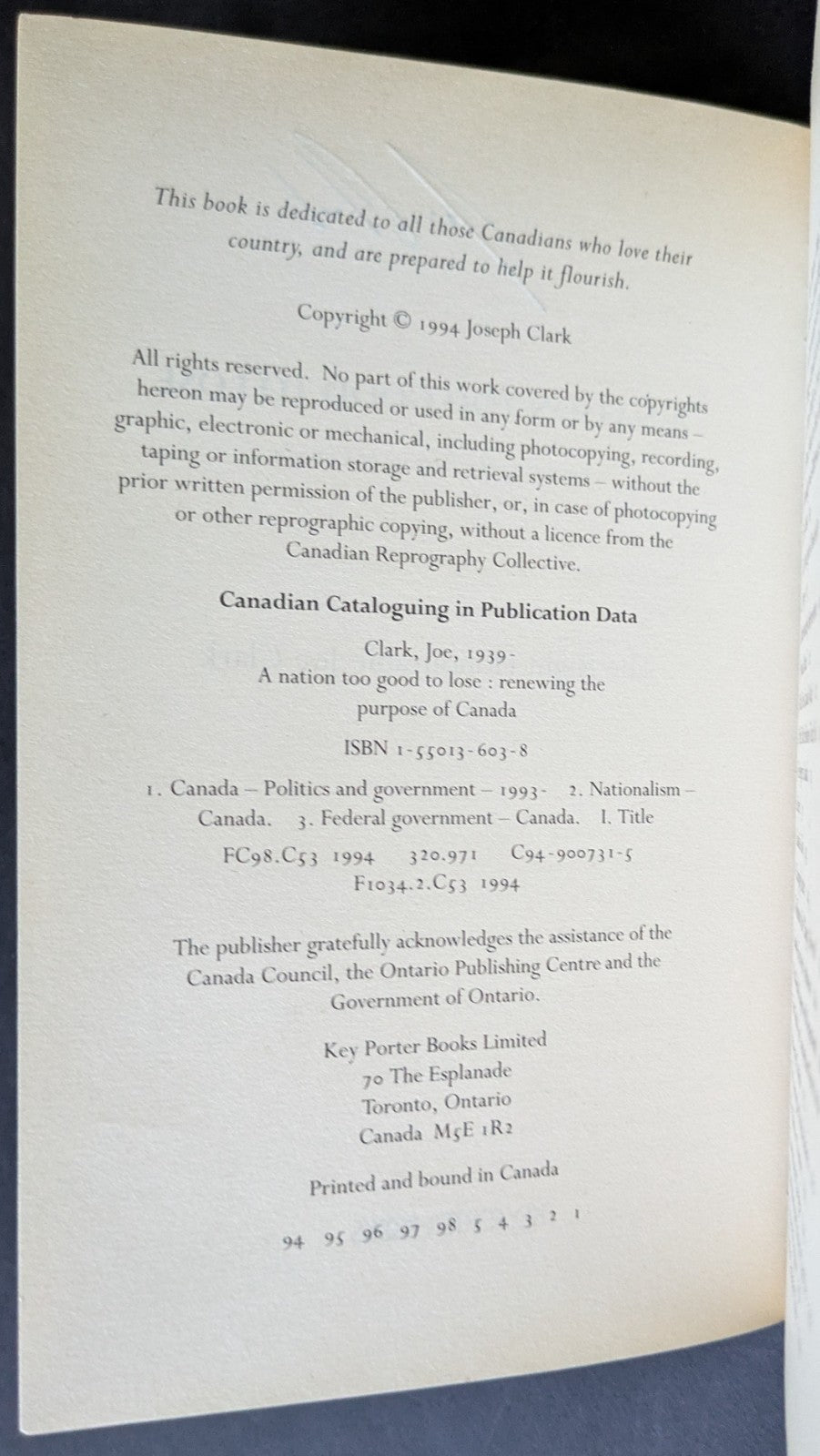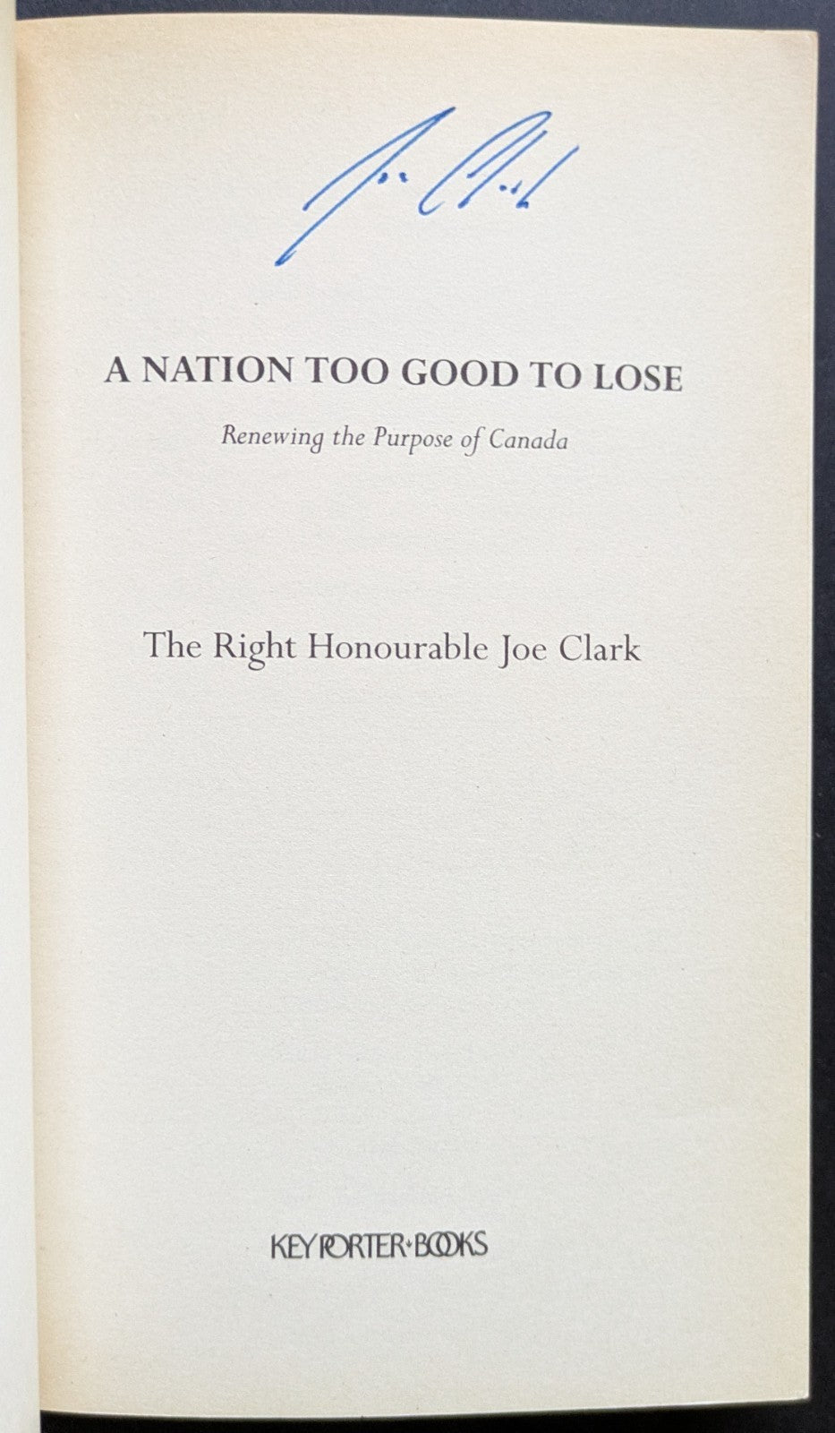- Prime Minister Of Canada Joe Clark Signed Autographed Paperback Book