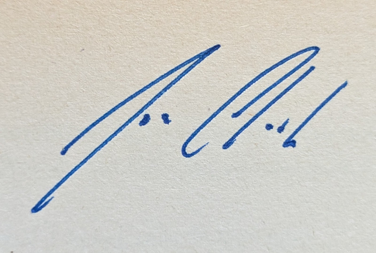 - Excellent condition; autograph presents well with no fading or smudging, inside contents are clean and complete, some slight corner and edge wear