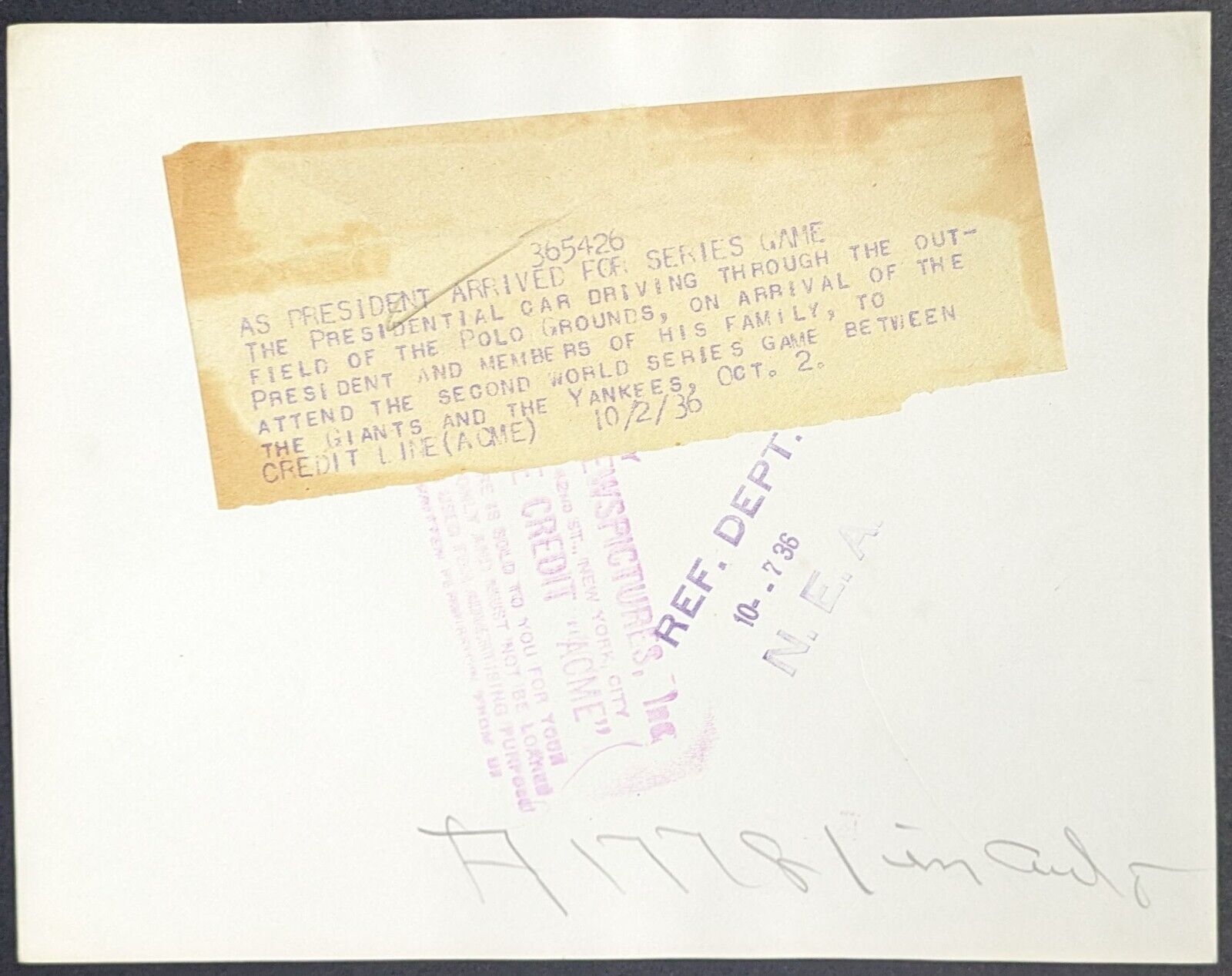 - Excellent condition; some surface creasing, slight corner and edge wear, photographers stamp and paper caption on back