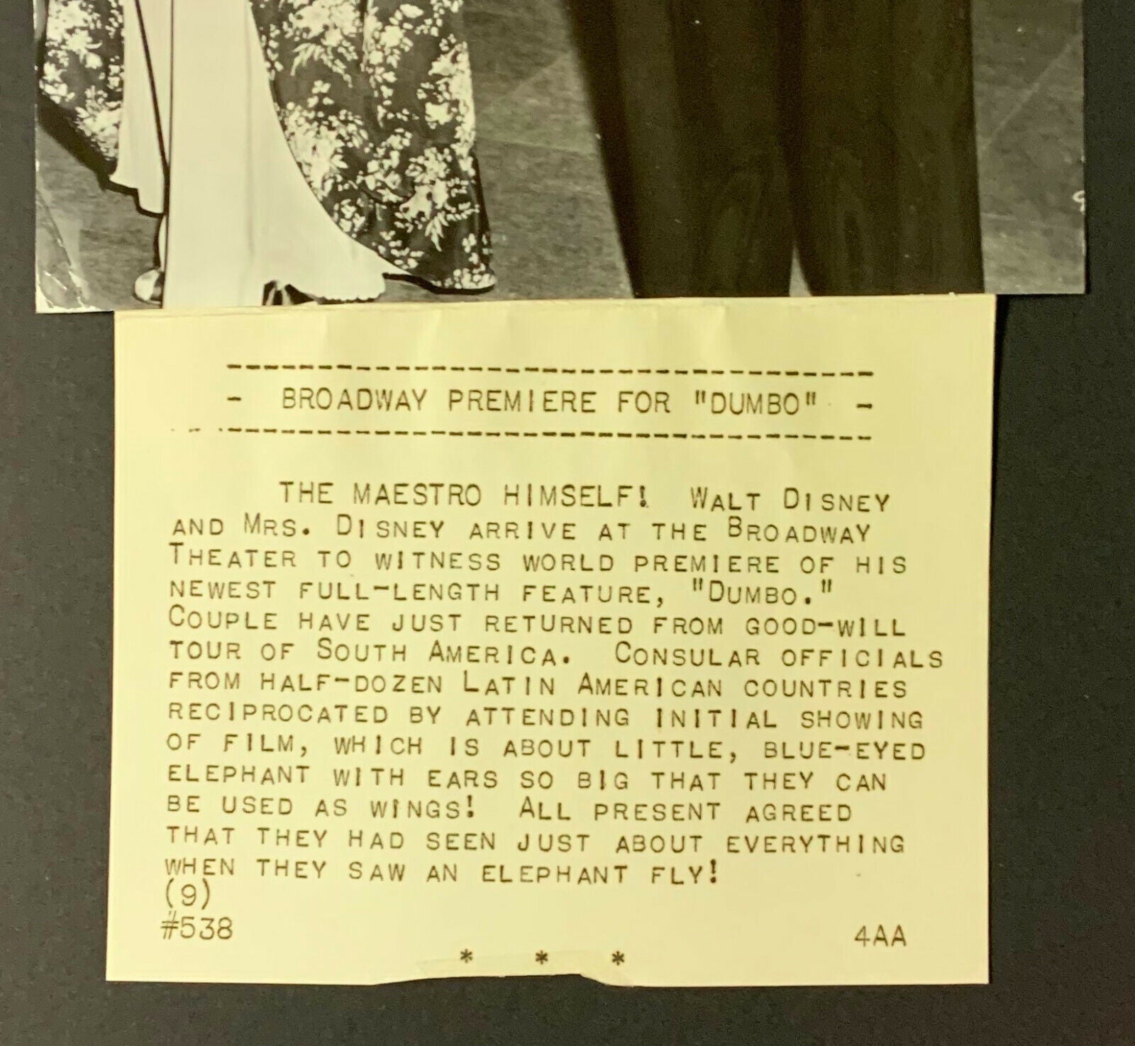 - 1941 photo of Walt Disney and his wife on the red carpet for the premier of his now iconic fil "Dumbo"
