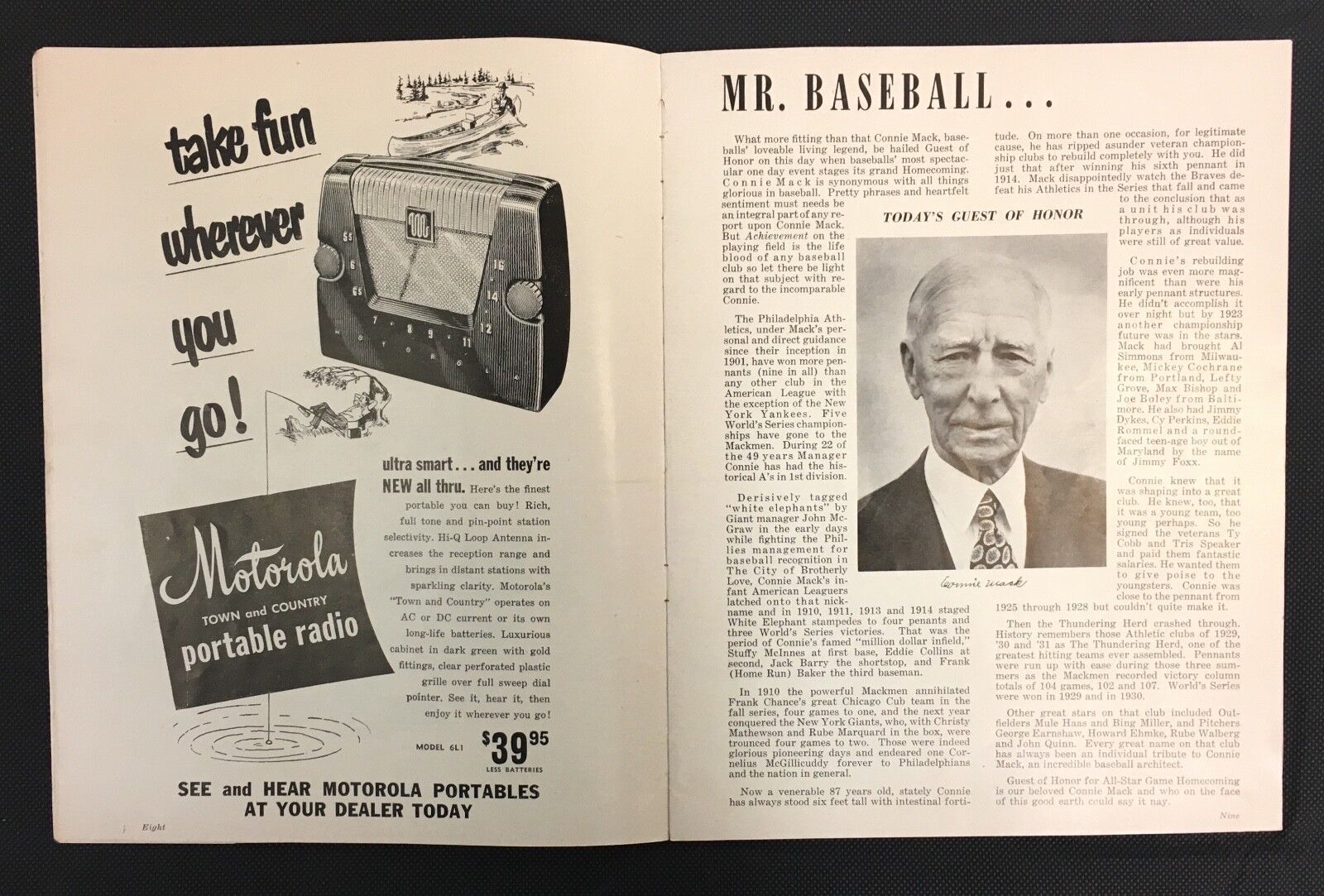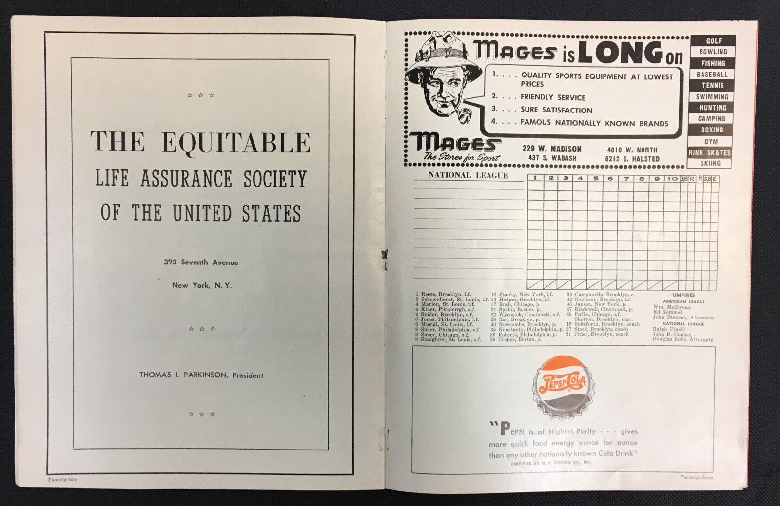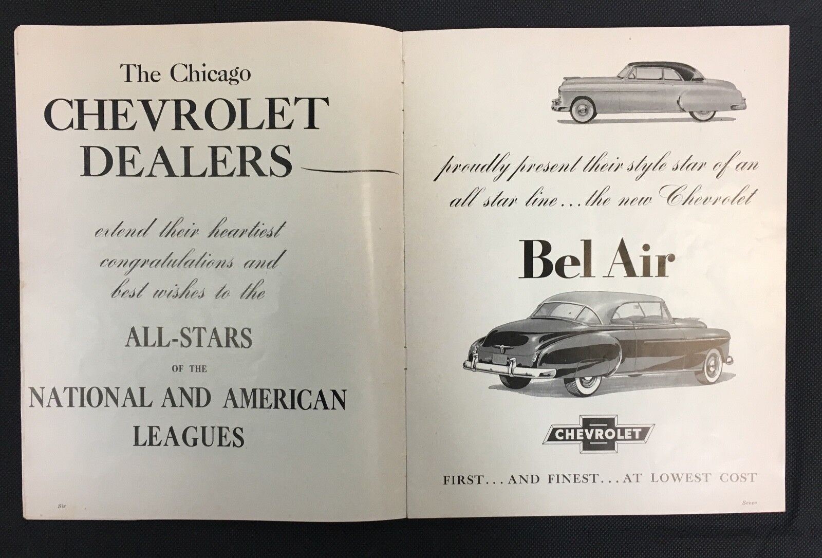 - 1950 MLB All Star baseball game program from Comiskey Park in Chicago. This was the 17th All Star game and was the first to go into extra innings. Red Schoendienst hits a solo homer in the 14th to give the National League a victory. Ted Williams robs Ralph Kiner of a double in the 1st inning and fractures his elbow making the play.