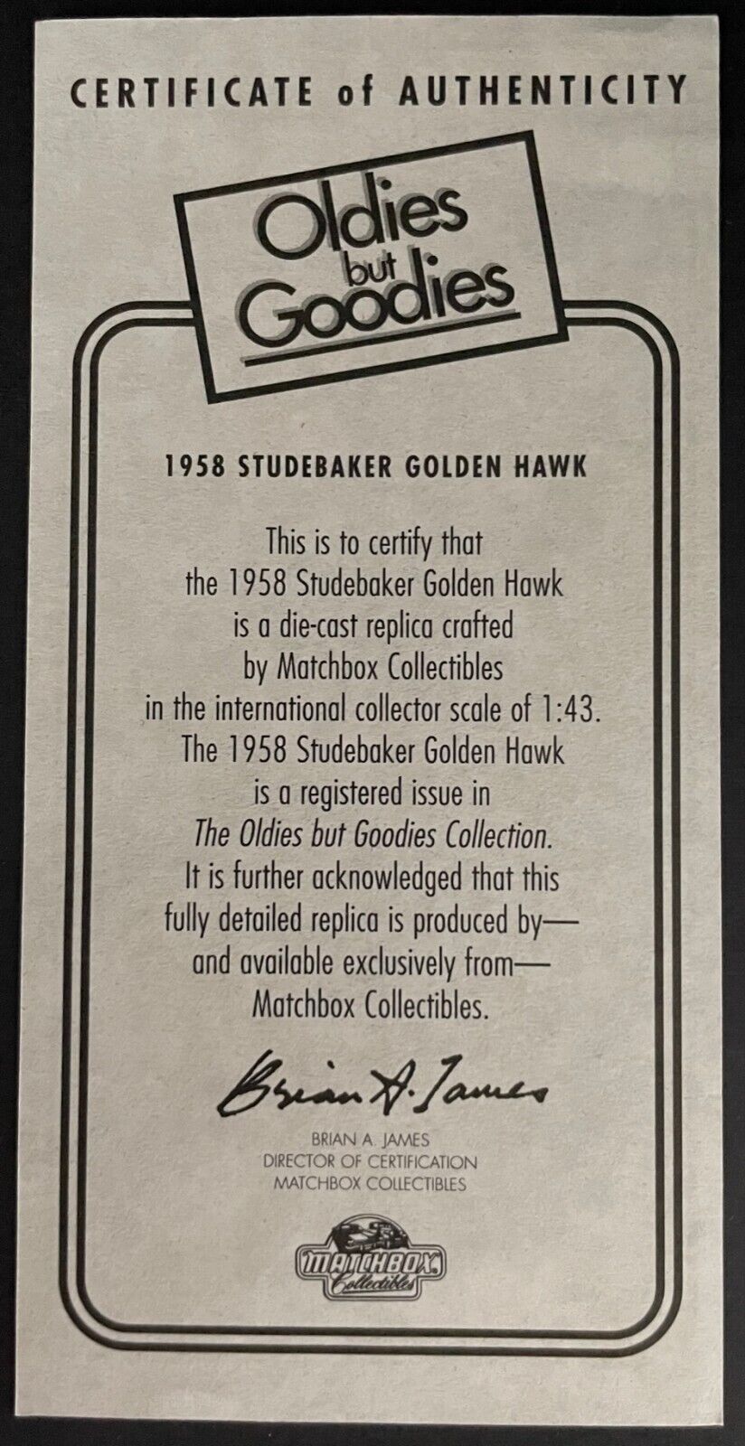 - Certificate of authenticity states this model is a "1958 Studebaker Golden Hawk" from “The Oldies but Goodies Collection”