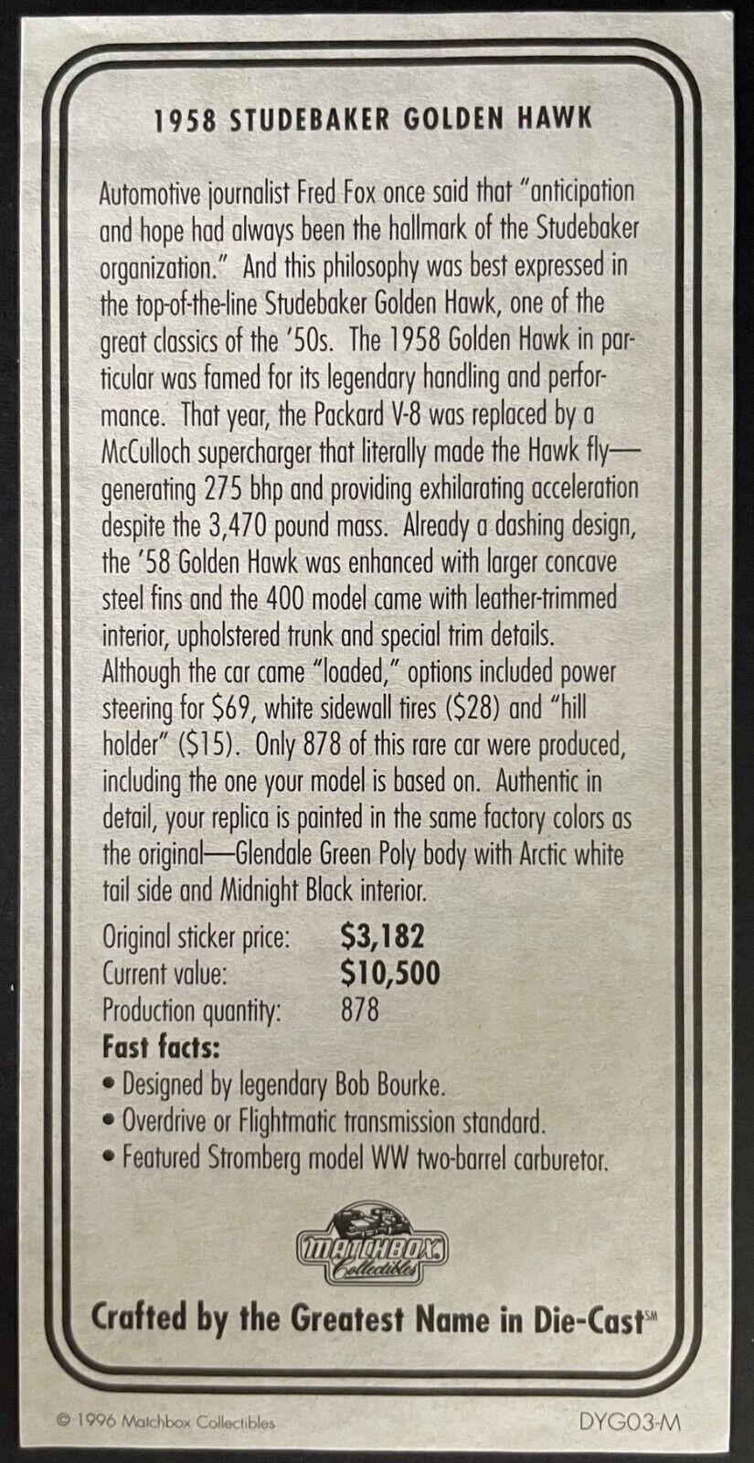 - 1958 Studebaker Golden Hawk dinky die cast metal Matchbox Collectibles model car