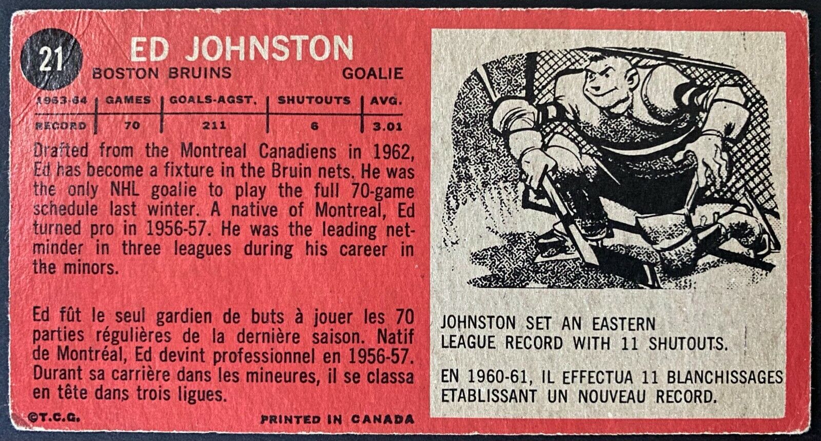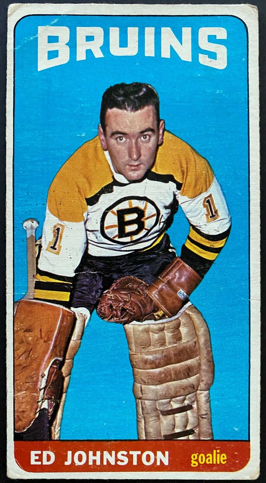 - 1964-65 Topps tallboy hockey card for Boston Bruins Goaltender Eddie Johnston