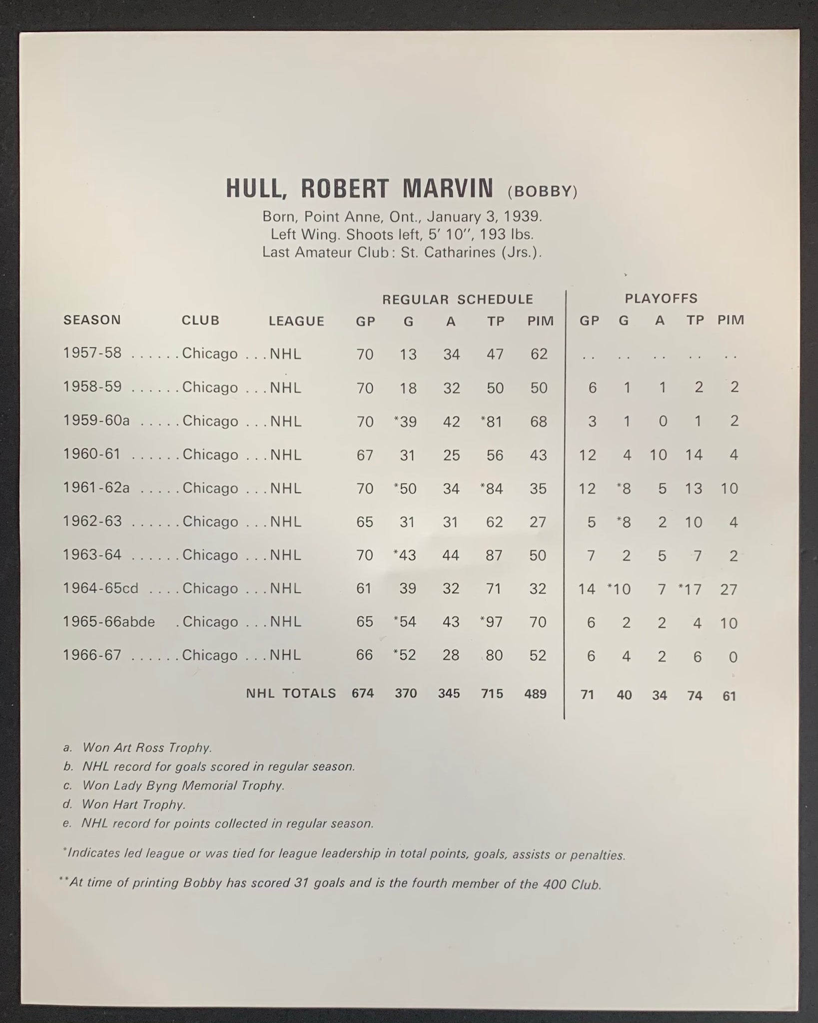 1967 Bobby Hull Team Issued 8x10 Photo with hockey stats on the back