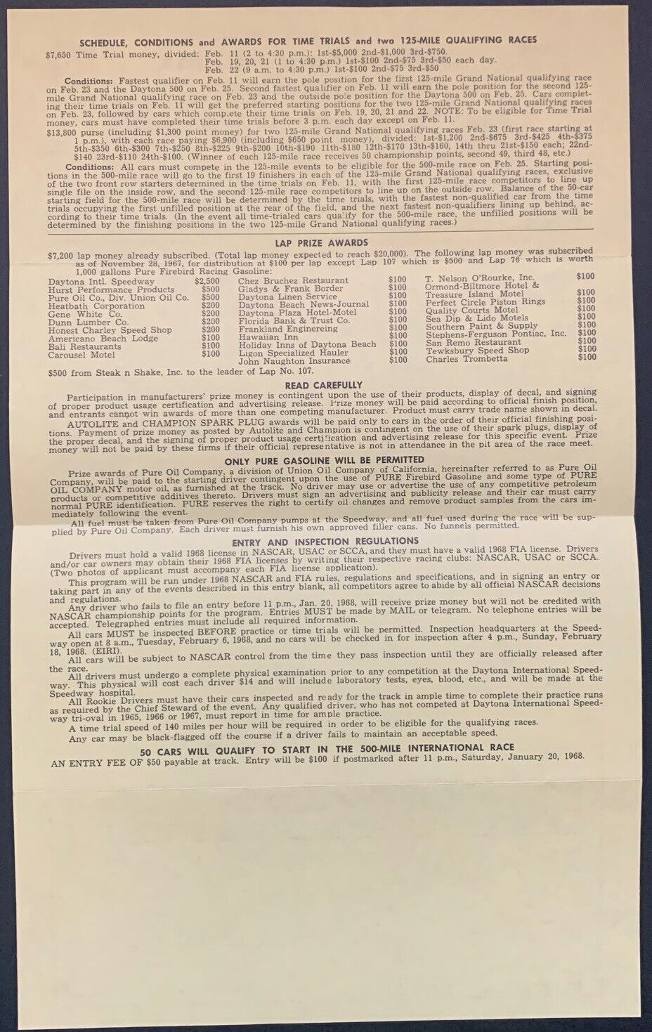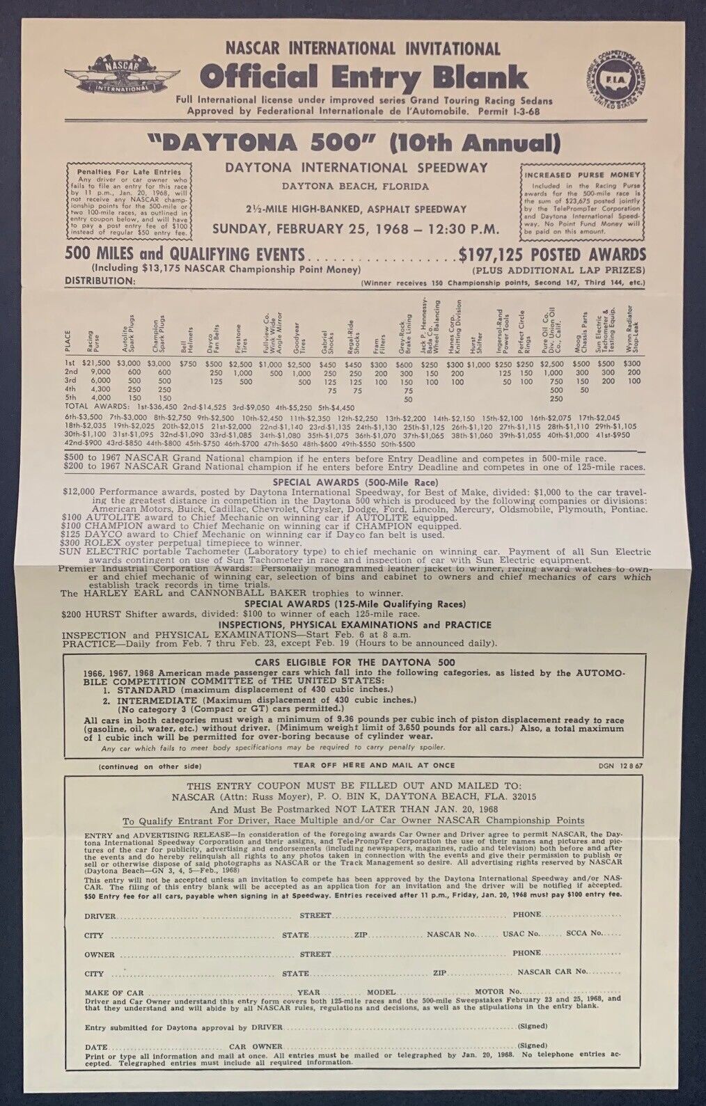 - Front of form is an application to race in the 1968 10th annual Daytona 500. Back of form provides information and applicant conditions
