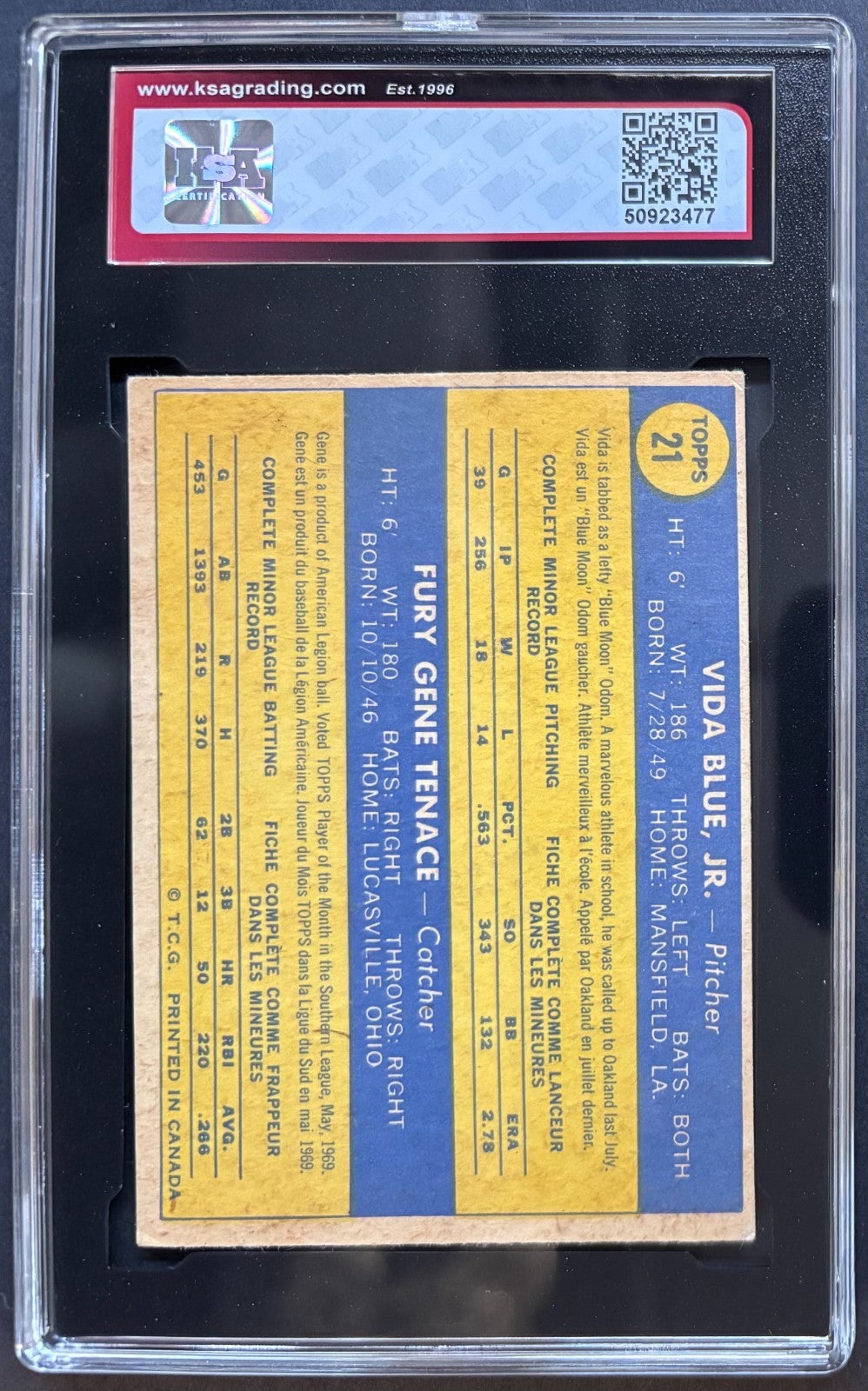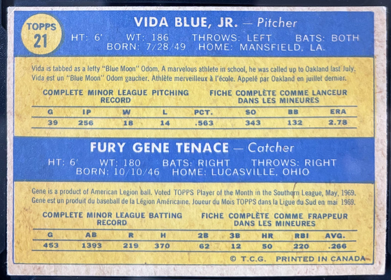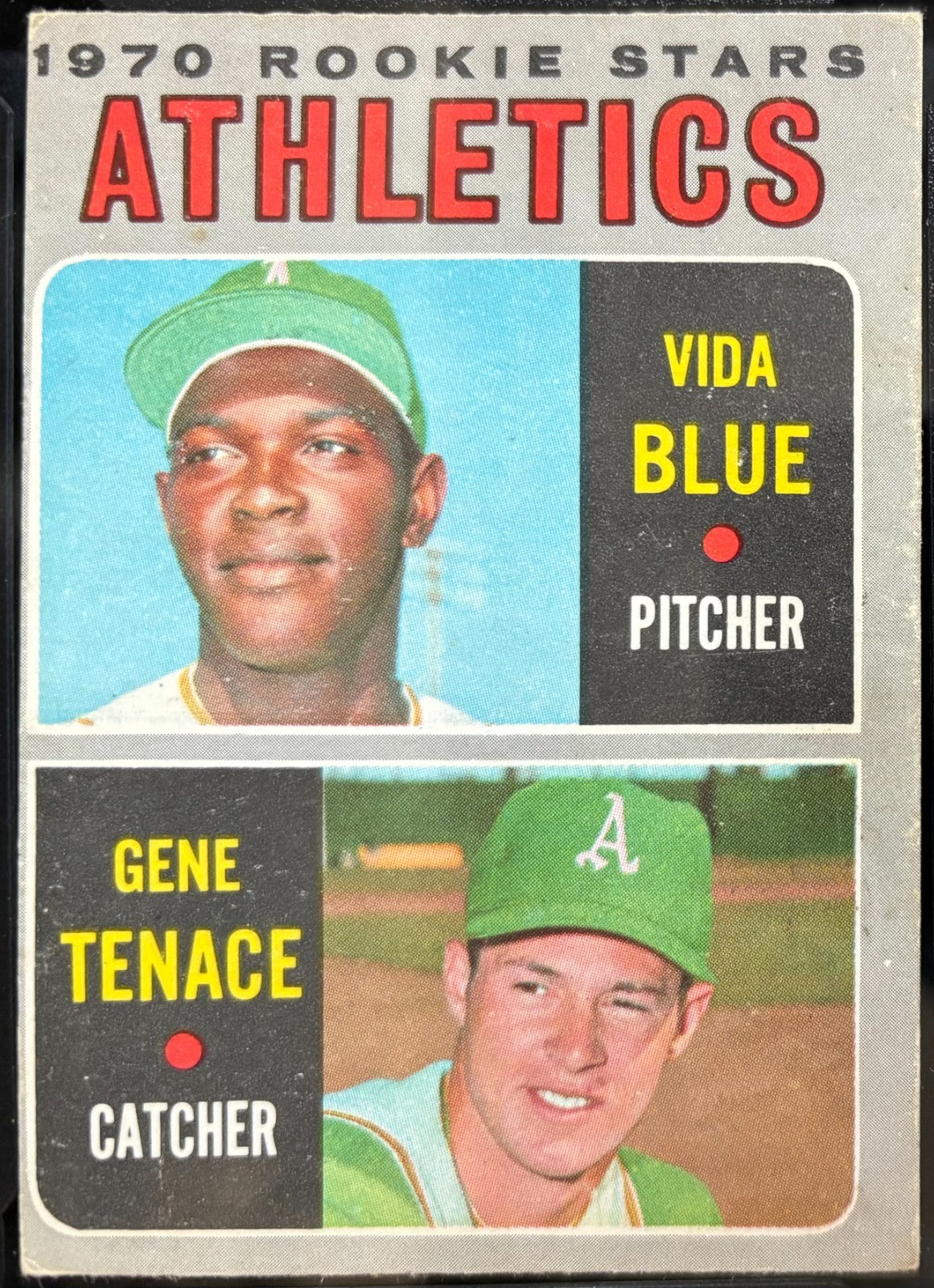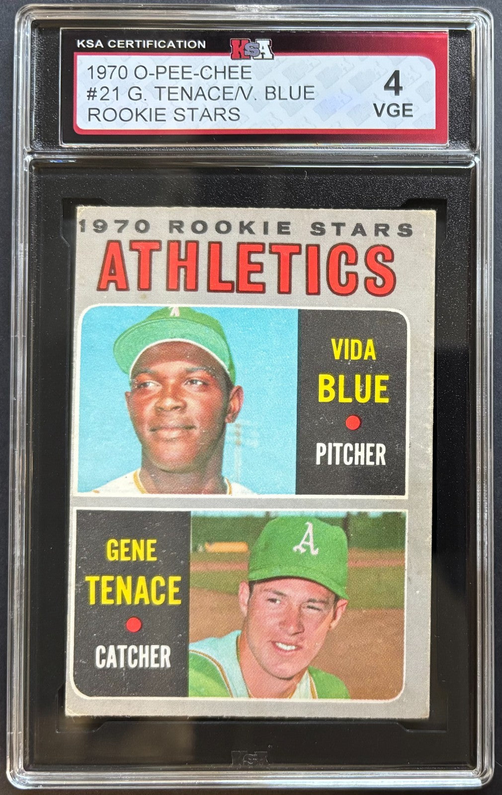 - 1970 O-PEE-CHEE (OPC) #21 "1970 Athletics Rookie Stars" vintage baseball card featuring rookies Vida Blue and Gene Tenace