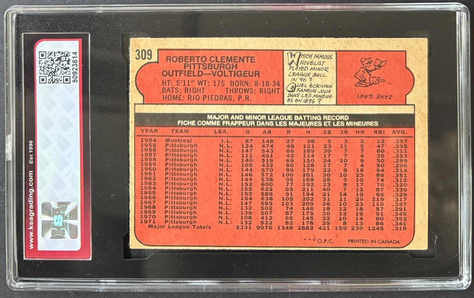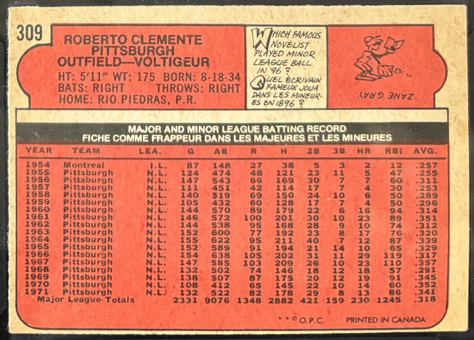 - 1972 O-PEE-CHEE (OPC) #309 Roberto Clemente baseball card