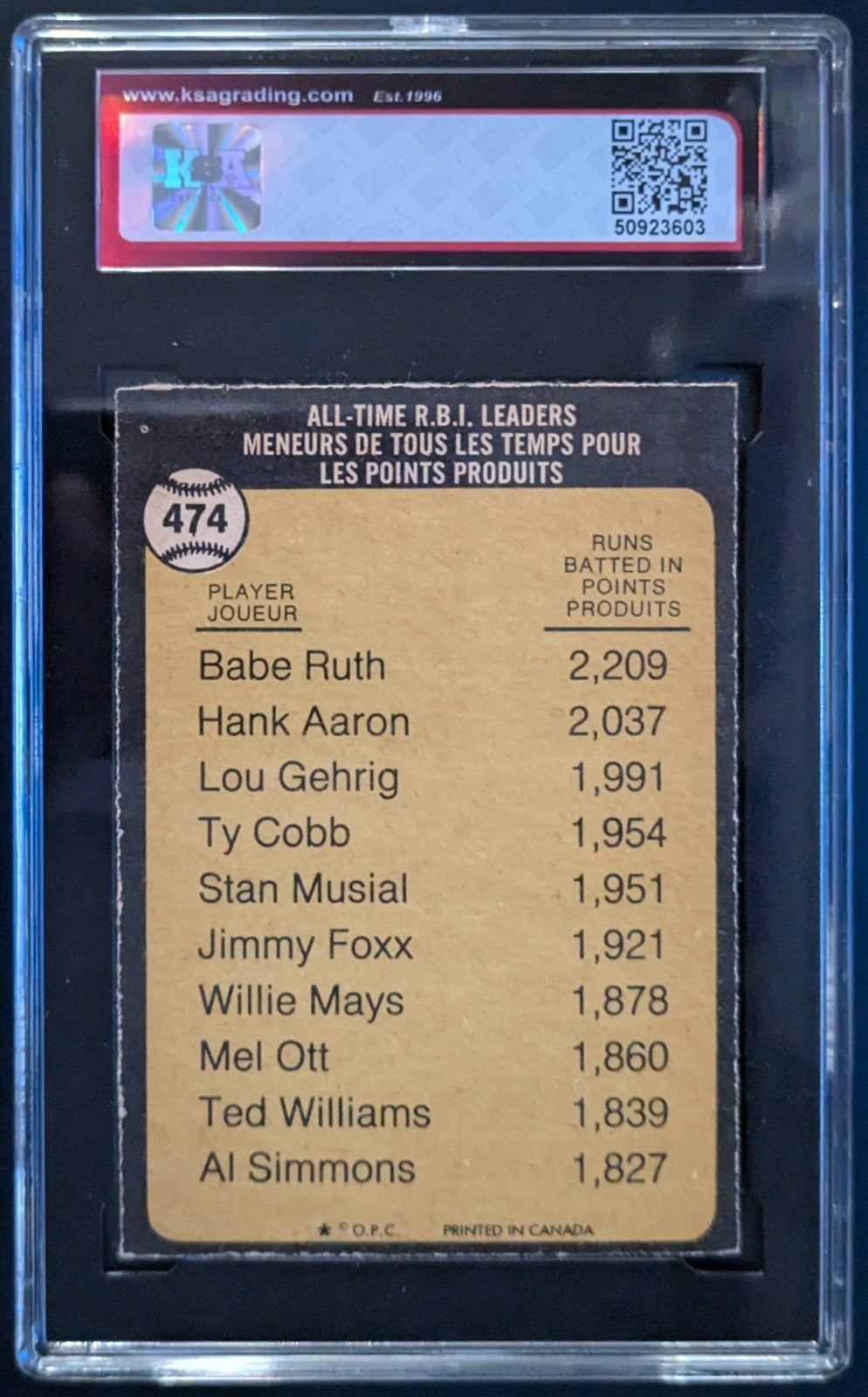 - 1973 O-PEE-CHEE #474 Babe Ruth All Time R.B.I. Leader Baseball Card