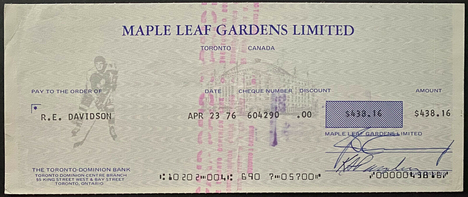 - Vintage 1976 Maple Leaf Gardens cheque / check to scour + former player Bob Davidson