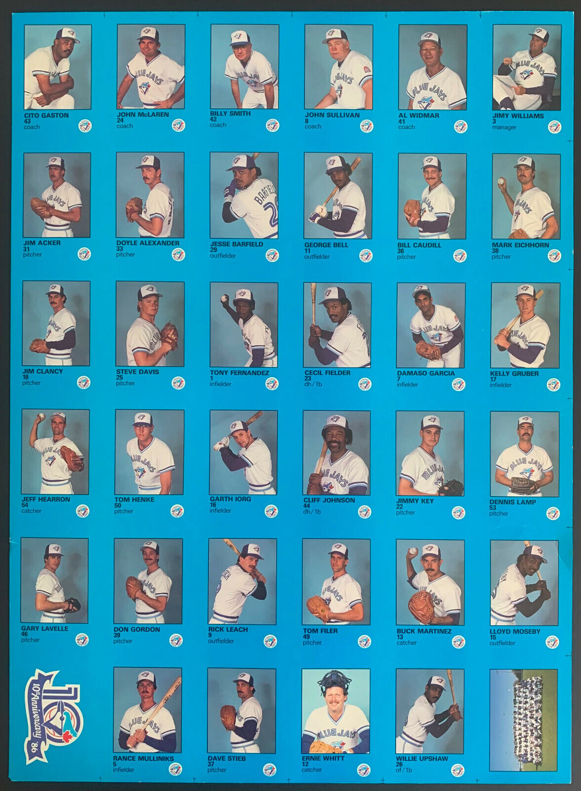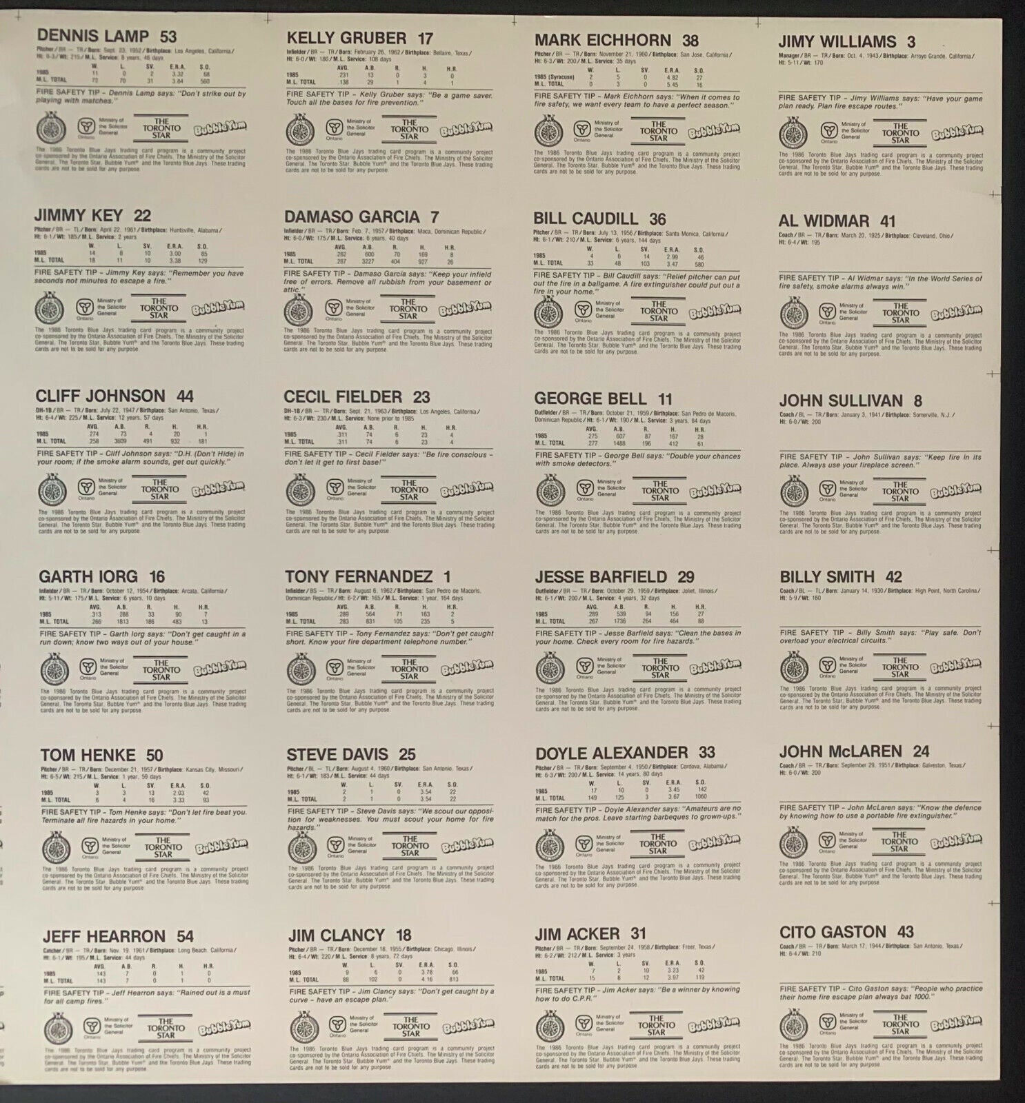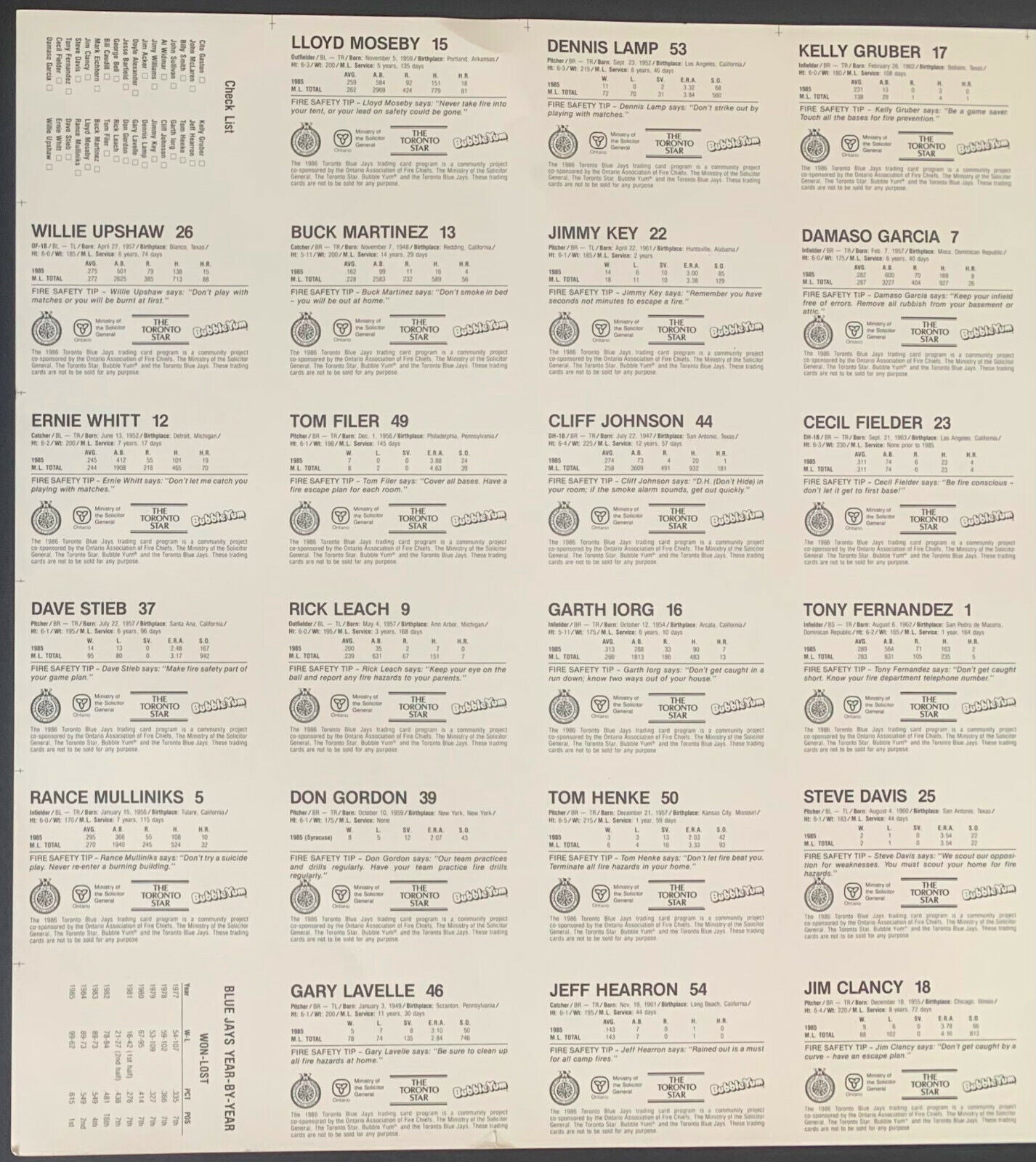 - 1986 Fire Safety MLB baseball Toronto Blue Jays uncut 36 card sheet produced by The Toronto Star