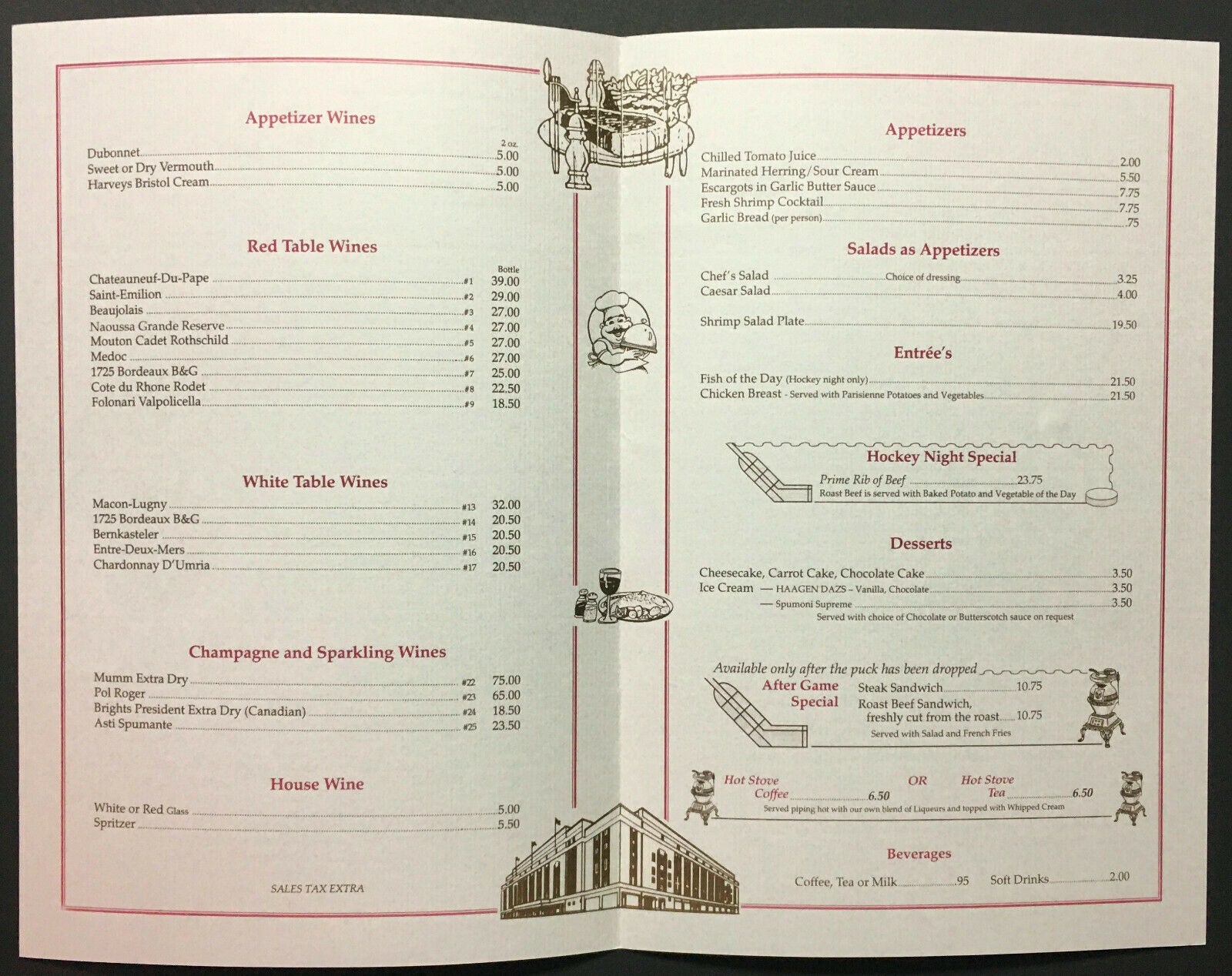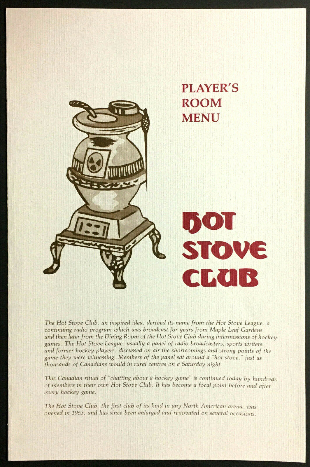 Vintage circa 1990 Maple Leaf Gardens Hot Stove Club players room restaurant menu