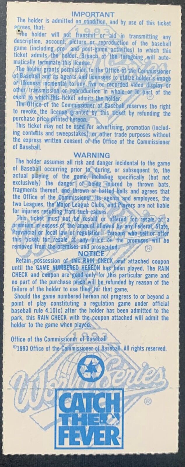 - 1993 MLB World Series Game 2 Ticket Stub Toronto Blue Jays vs Philadelphia Phillies @ Toronto's Skydome