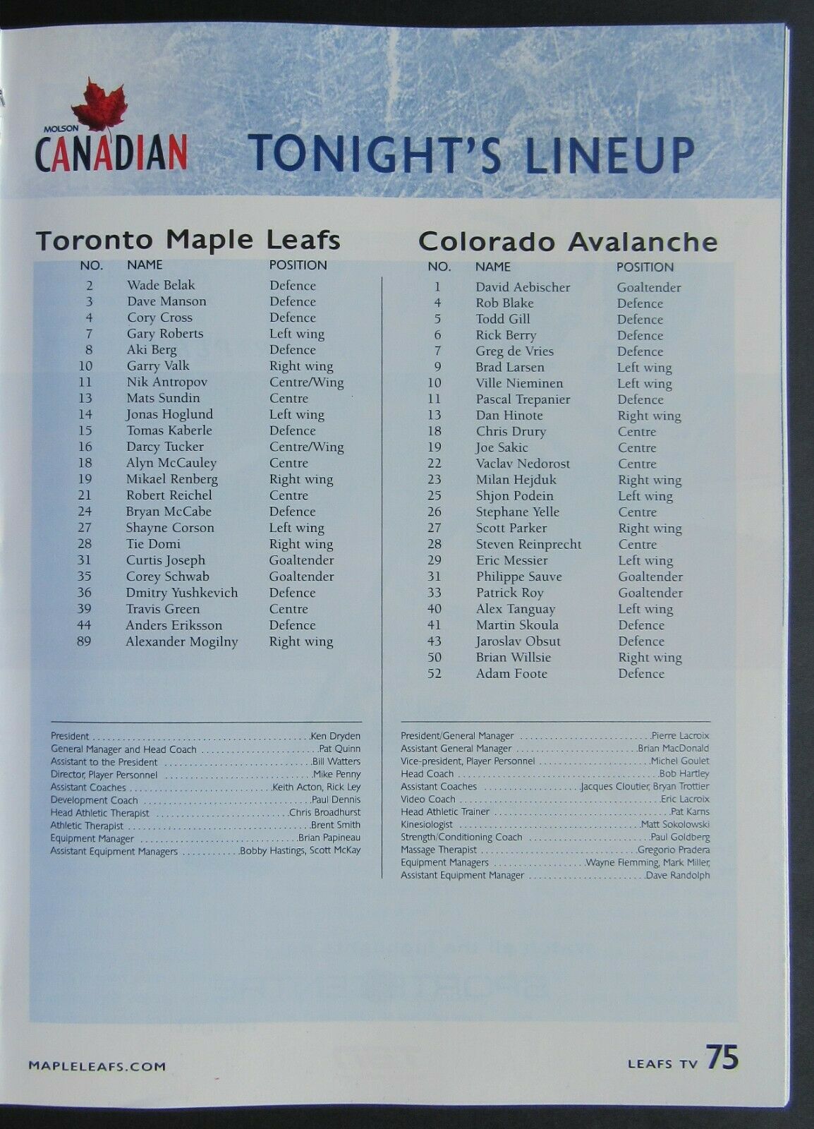 2001 Air Canada Centre Maple Leafs 75th Anniversary Program Toronto vs Colorado