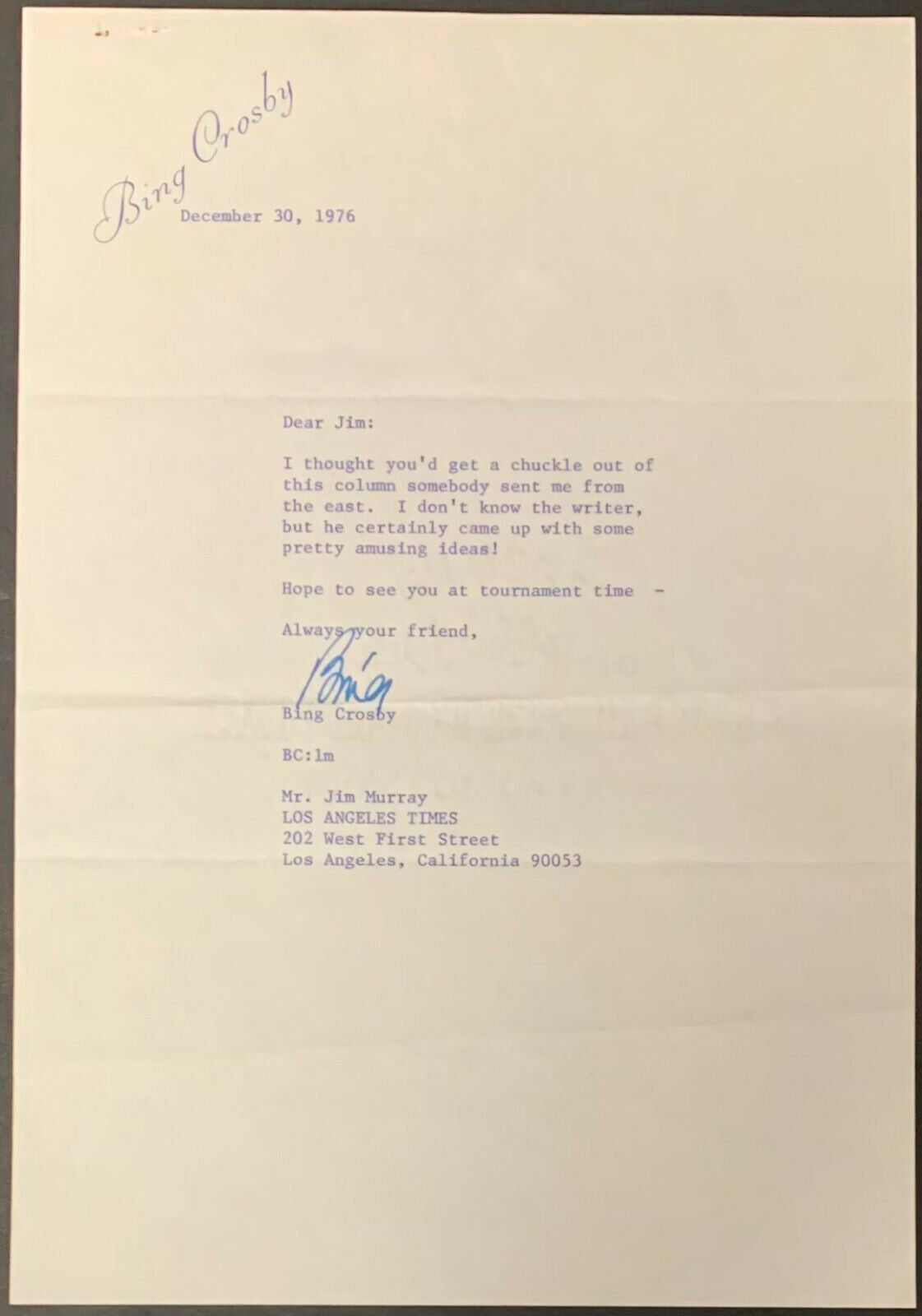 - Very Well Preserved 1976 letter from Bing Crosby on his personal letterhead to a friend, Jim Murray, writer for the Times.