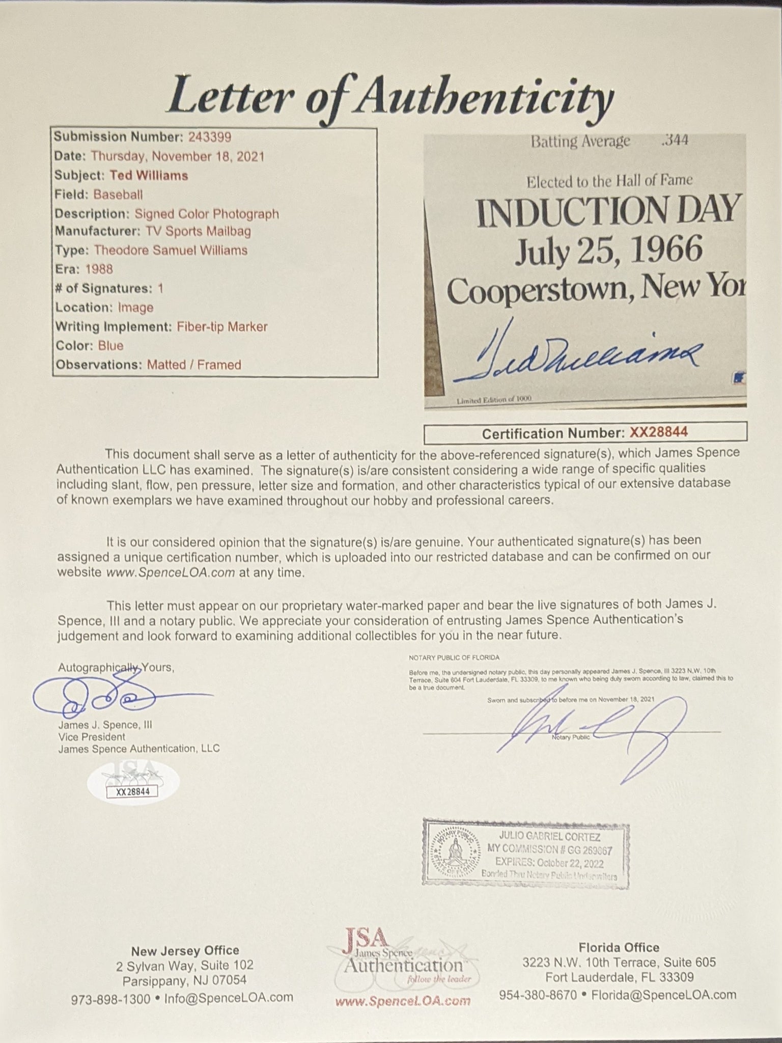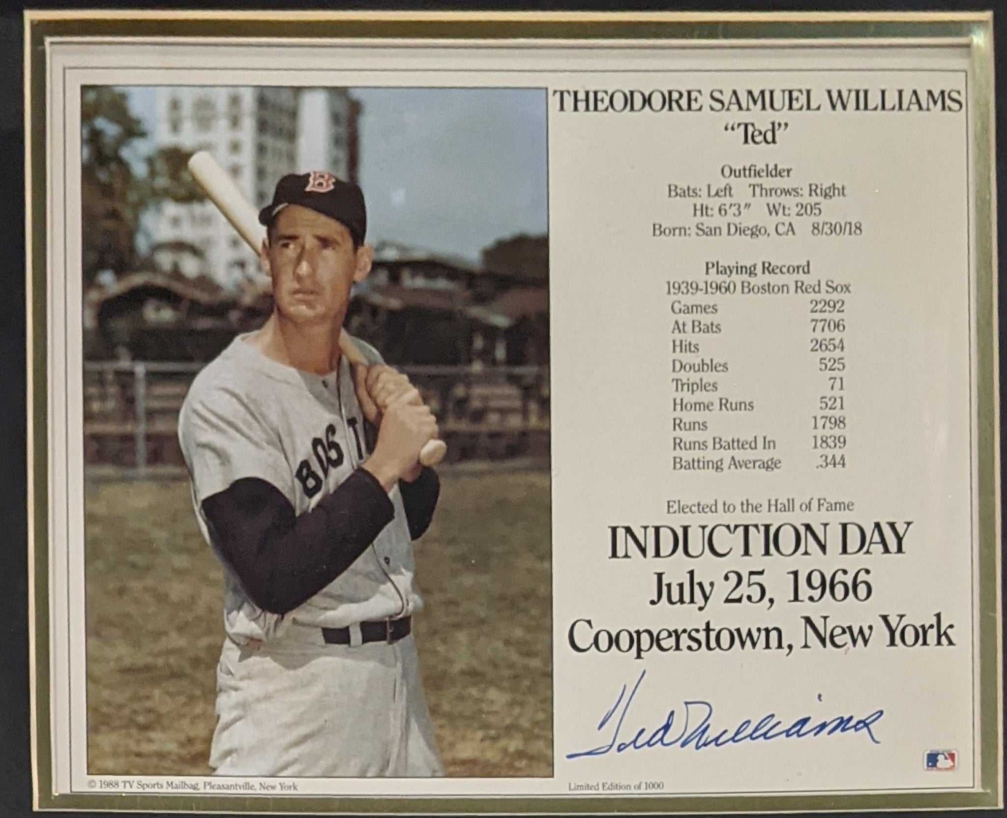 - Signed and framed MLB Legend, Ted Williams Photo with LOA certification.