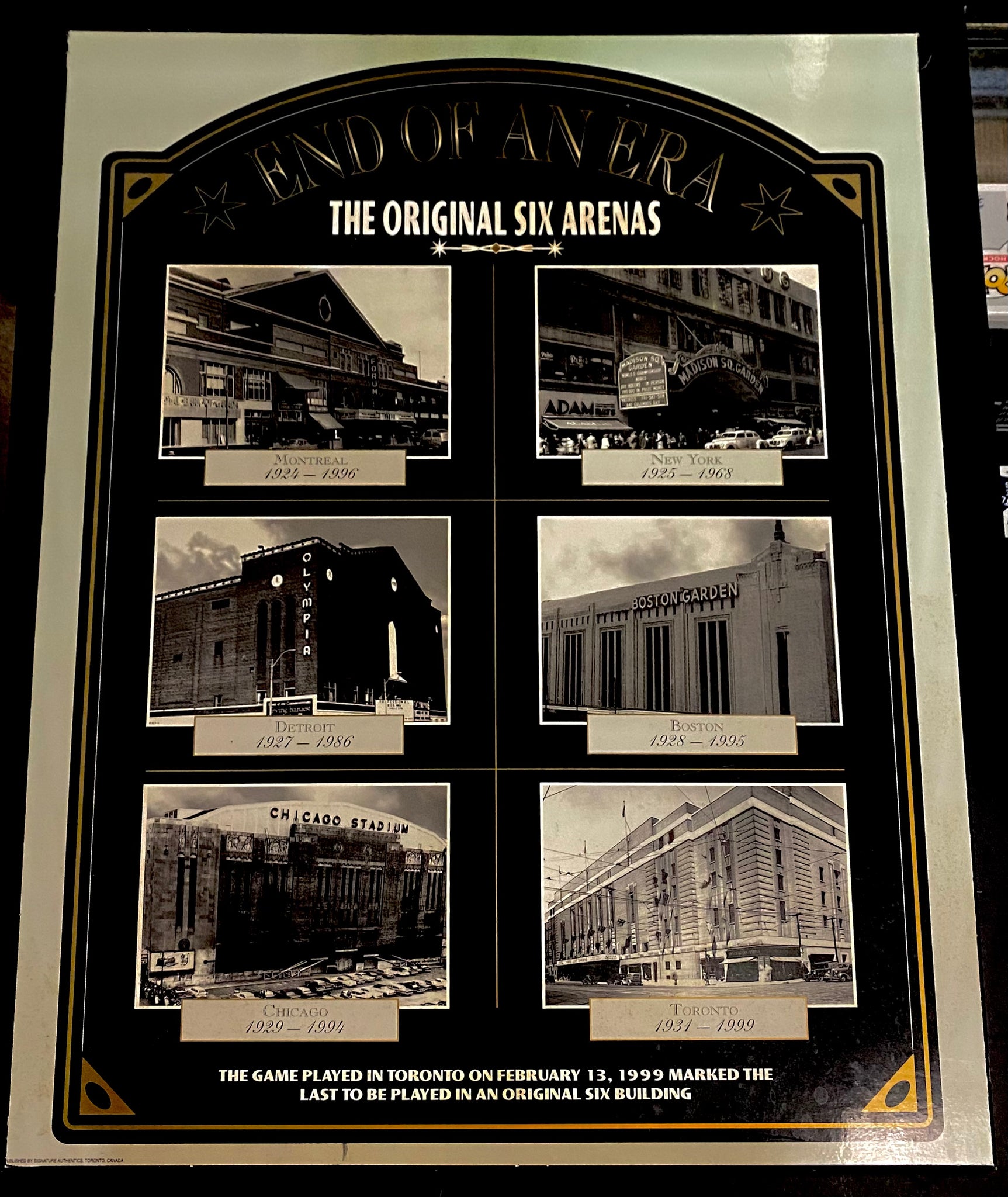 - Plaque remembering the original, original six teams’ arenas including The Forum, The Maple Leaf Gardens, Boston Garden, Chicago Stadium, and The Original Madison Square Gardens